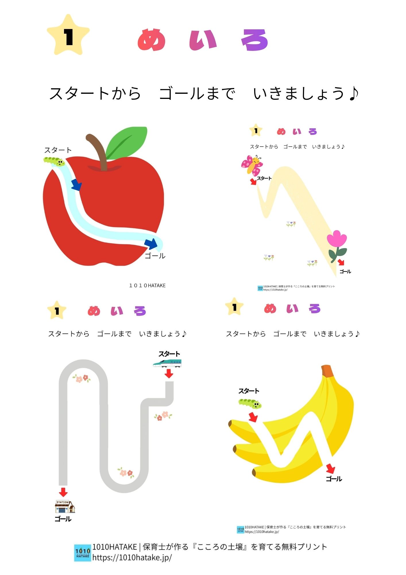 迷路 迷路は、スタートからゴールまで道をたどるあそびです。 線を目で追いながら進めることで、考える力と書く力の土台を同時に育てます。 迷路についての説明は→こちら ★ステップ1~3まで段階別になっています。お子様の発達段階に合わせてお使いください。 ステップ1 スタート・ゴールを知ろう ステップ2 迷路をしよう ステップ3 発展・迷路